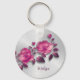 Este elegante chaveiro floral apresenta delicadas flores cor-de-rosa-quente com sombra sobre fundo prateado