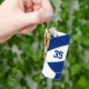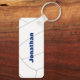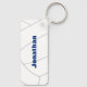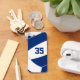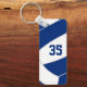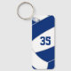 Este chaveiro de vôlei apresenta a imagem abstratamente sobredimensionada de um vôlei azul e branco na frente, sobre a qual você pode personalizar o número de camisa do atleta - no verso, o nome do atleta sobrepõe-se a um vôlei branco básico, igualmente superdimensionado - por katz_d_zynes