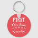 Este chaveiro vermelho faz o presente perfeito para qualquer novo avô. Ele diz "Primeiro Natal como Vovô" em uma fonte branca e moderna.