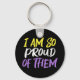 I am so proud of them keychain written in yellow, white, and purple on black for nonbinary parents. Show your pride for your non-binary child with the non binary colors for a mom or dad.