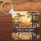 A chaveiro de escritura de aspas inspiradoras retrata uma bela fotografia da natureza com o sol brilhando através de árvores nuas na floresta e refletida na água. Apresenta Proverbos Versos Bíblias 4:18, "O caminho dos justos é como o sol da manhã, brilhando cada vez mais brilhante até a luz do cheio do dia."