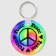 Chaveiro de Paz e Amor - sinal de paz e corações num fundo espiral arco-íris.