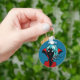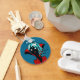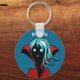 Chaveiro personalizado com gótico de bonitinho, com uma ilustração digital de um personagem brilhante, de pele escura, com olhos brilhantes, cabelos azuis, ventoinhas e capa vermelha vibrante sobre fundo azul escuro. Divertido excelente de design para o Halloween.