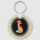 Uma keychaina com uma ilustração foxa de laranja fofa dentro um círculo preto. Ele também está vestindo um chapéu de anã vermelho e tem sotaques decorativos verdes festivos na cauda e no peito.