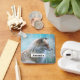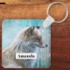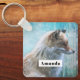 Uma chaveiro com uma foto de uma raposa fofa sozinha. Colocado sobre um fundo azul de inclinação.