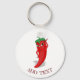 Um personagem de desenho animado de pimenta vermelho e quente. Design original. Editar texto para personalizar. Cadeias de chave personalizadas. Ideia do presente.