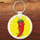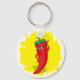 Um personagem de desenho animado de pimenta vermelho e quente. Design original com fundo de tela de tinta amarela. Cadeias de chave personalizadas. Ideia do presente.