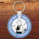 Keyring para negócios elétricos. Ilustração de reparos elétricos e eletrônicos em um estilo divertido de desenho animado. O homem está olhando para vários fios enquanto recarrega uma propriedade. Personalize-o com o nome e o número de contato da sua empresa.