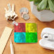 Retrato de Beethoven em quadrados vermelhos, amarelos, azuis e verdes. Imagem com efeito gravado aplicada ao design. Cadeias de chave personalizadas.