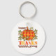 Chaveiro de Ação de Graças colorido no estilo da ranhura retrorativa. Imagens retrorreflectoras "Feliz Dia de Ação de Graças", com flores bonitinhas, estrelas e uma abóbora de cadarço.