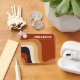 Este chaveiro de casamento retrógrado apresenta linhas onduladas em castanho e laranja, lembrando os anos 70 e estilo de vida hippie. Favorecimento de recepção de vintage em negrito com script branco funk do nome do casal próximo às linhas de curva abstrato. Alcance junto com este design de som terrestre divertido.