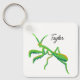 Este chaveiro apresenta uma ilustração pintada de um louva-deus em verde-claro com sotaques laranja e está pronto para ser personalizado com um nome em letras negras de roteiro.
