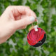 Uma rosa vermelha brilhante veste esta cadeia de chaves personalizada. A imagem rosa e o texto facilmente personalizado em cinzas prateadas são colocados em um fundo preto dramático.