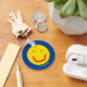 Um sol amarelo de olhos verdes sorrindo sobre um fundo azul. Adicione seu próprio texto. Você pode alterar a cor do texto e do plano de fundo.