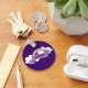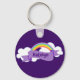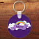 Belo chaveiro roxo que apresenta um belo e alegre arco-íris com nuvens brancas divertidas em um bonito fundo violeta. Personalize com um nome para um presente LGBT excelente.