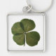 Fotografia de um trevo real de quatro folhas na chaveiro de metal. Tome sorte e não esqueça a coleção inteira.