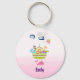 Um chaveiro personalizado com uma ilustração fofa no estilo de berçário com uma arca cheia de animais selvagens e uma borboleta voando sobre o topo e uma baleia amigável jorrando água abaixo. Algumas nuvens azuis flutuam por aqui. Colocado sobre um fundo sombrio de rosa claro.