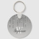 This chic keychain features a silver background with sparkling silver faux glitter drips. Customize it with your initial in white serif font and your name in dark gray handwriting-style brush script.
