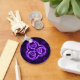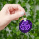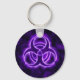 Chaveiro preto com um símbolo de risco biológico roxo brilhante.