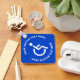 Chaveiro quadrada com símbolo branco desativado em um fundo azul e texto circular branco.