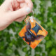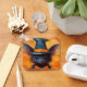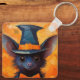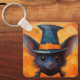 This cheerful Halloween bat illustration features big round eyes, a bright orange bow tie, and a pointy witch hat, all set against glowing painterly textures. A cute and spooky character perfect for Halloween mail, art collectors, or seasonal fun.