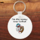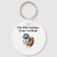 Um design de futebol com macaco-meias em T-shirts, cartas, canecas, sacos de tota, autocolantes, chaveiros e outros artigos com um jogador de futebol de macaco-meias e um texto em estilo infantil que diz "Este macaco adora futebol!".