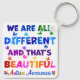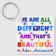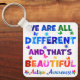 Citação inspiradora de "Somos Todos DIFERENTES E Isso é LINDO" com quebra-cabeça autistas únicos, e borboletas coloridas voando em segundo plano para apoiar e defender a consciência do autismo.