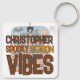 Ready for some spooky vibes with this fun Halloween keychain. On the front is an illustration of a haunted house with bright orange kawaii pumpkins in the garden. Flying around are cute bats and ghosts and i round orange moon. On the back is the text 'Spooky Season Vibes' and a template to add your name to personalize, Ideal for a Halloween treat or just some spooky fun.