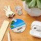 Uma chaveiro com uma fotografia adorável. Uma praia branca arenosa com água azul azure. Relaxando a imagem com um céu ensolarado e um surf espumante gentil com algumas folhas tropicais bonitinhas moldando a imagem.