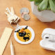Um gato de bruxa negra que se senta com uma lua de colheita brilhante no fundo enquanto dois morcegos voam! Camisas de Dia das Bruxas de Gatos e Morcegos, fatos-fatos, camisas, canecas, ímanes, botões, bolsas de truque ou de tratamento, cartões, adesivos e outros roupas e presentes de Halloween fofos e coloridos.