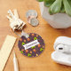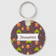 Um chaveiro com um padrão temático divertido de acampar. Colocado sobre um fundo castanho avermelhado. Elementos no padrão incluem uma fogueira, uma tenda, uma guitarra, uma pá e mochila. Personalize com um nome dentro um quadro/faixa branco em forma de fita.