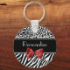 Um chaveiro de padrão robusto de animais preto e branco com faixas de zebra modernas no fundo e uma impressão na moda-leopardo no topo e embelezada com uma fita vermelha-menina amarrada num arco. Personalize o teclado de moda das mulheres chic adicionando seu nome. Imagem plana, não fita real.