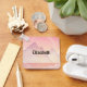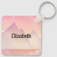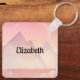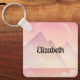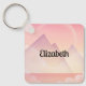 Um chaveiro com uma bela ilustração encantadora. Pastel de cor rosa e pêssego. Paisagem com planetas, montanhas e nuvens.