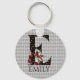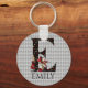 Whimsical Wonderland, o templo chaveiro, apresenta imagens coloridas de Alice e Rainha do Coração com letras grandes / iniciais E com suites de cartas preto/ouro/vermelho, preenchendo o padrão em um fundo de harlequim de cinza antigo. Personalizar ainda mais com texto de nome personalizável