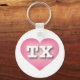 Esta cadeia-chave apresenta um coração legal e calmo, cor-de-rosa, com um centro lavado em branco, contendo as letras maiúsculas, em negrito, TX, a abreviação oficial do Texas, o estado estelar solitário.