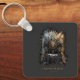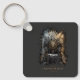 A small round acrylic keychain displaying the complete 'Throne of Dust' dark fantasy art. The complex throne, made of gears, skeletons, broken swords, and glowing gold central mandala, is printed with exceptionally high resolution. The text 'THRONE OF DUST' is legible at the bottom with gold flourishes and black/gold paint splatters. Perfect as an edgy accessory for keys, bags, or backpacks. Durable with a silver metal split ring.