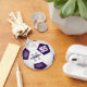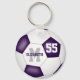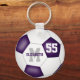Este simples chaveiro de futebol desportivo para raparigas ou rapazes apresenta uma bola de futebol de estilo tradicional com painéis roxos e brancos - personalize com o nome do jogador, o monograma ou a letra de varsidade e o número de camisa - por katz_d_zynes