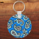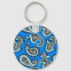 Vibrant paisley patterns in shades of blue, teal, black, and white are arranged on a bold blue background. The design features intricate swirls and dots, creating a dynamic and stylish visual effect.