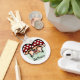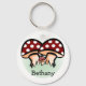 Chaveiro com três cogumelos vermelhos, ferramentas bravas com pontos brancos. Abaixo está uma modelo para adicionar um nome para personalizar.