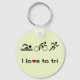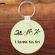 Um presente excelente para quem participa de triatlões. Este keyring tem um slogan divertido em texto preto com um coração vermelho, num fundo de verde limão pálido. Há três ícones pictogramas dos desafios envolvidos - natação, ciclismo e corrida - e a legenda é "Eu amo tricotar".
