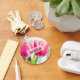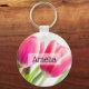 Chaveiro personalizado com uma bela fotografia de primavera com 2 tulipas cor-de-rosa e folhas verdes brilhantes.
