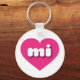 Este chaveiro apresenta um coração roxo e vibrante, cor-de-rosa, contendo as letras minúsculas em negrito, arredondada, branca mi, uma versão lúdica da abreviação para Michigan, estado dos Excelentes Lagos.
