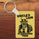 Funny key chain. Uncle Sam icon with surveillance camera head. Custom background color. Custom text at the back side.