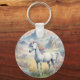 Um chaveiro mostrando uma imagem sonhadora de um unicórnio branco com um mane arco-íris em pé num campo de flores. Ao fundo estão montanhas majestosas. O presente perfeito para dar àqueles que amam unicórnios mágicos e místicos. Contém conteúdo generativo.