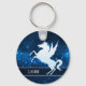 Aqui está uma chaveiro bonito que apresenta uma silhueta prateada de um unicórnio de criação, com um cintilante céu azul estrelado atrás dele. Seu nome também está em prata em uma banda semitransparente que atravessa o fundo da imagem. A parte de trás corresponde a azul escuro, com dois campos para o seu texto personalizado.