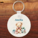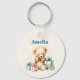 Chaveiro com uma bela ilustração com um ursinho de pelúcia estilo vitoriano. Vestindo um arco vermelho rico. Desenhado em um estilo vintage bonito e antigo. Presentes de Natal pastel vermelho e azul rodeados por este urso de coração quente.