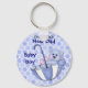 Doce chaveiro de bebê para Novo papai com adorável ursinho azul cavalgando em um guarda-chuva, pontos grandes e outros toques especiais. Personalize com suas informações.