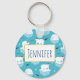 Um chaveiro com um lindo padrão de Natal com ursos polares em pé sobre gelo flutuante vestindo chapéus de anã vermelho. Pequenos iglos, flocos de neve e peixes cercam esses adoráveis ursos polares se resfriando na água. Fundo azul claro. Design de férias bonitas e caprichosas. Um quadro retangular com uma borda falsa de folha de ouro com o seu nome dentro.