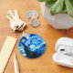 Chaveiro com a pintura a óleo de Vincent van Gogh na Noite Estrelada (1889). Inspirada pela sua estadia num asilo, a arte representa uma aldeia debaixo de um céu noturno de lua azul e amarela e estrelas. Um presente de excelente para fãs do Poste-impressionismo e da arte holandesa.
