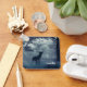 Chaveiro com uma foto de um veado real com galhadas em uma floresta sombria entre árvores iluminadas pelo sol. Neve caindo por toda parte.